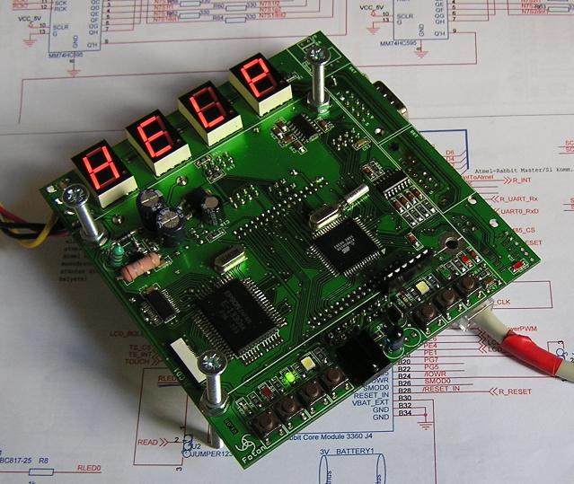 ATmega128 + Rabbit modul vezérlésű, Ethernet csatlakozással, perifériákkal (Infra, IrDA, LCD + érintőképernyő, ledek, gombok...), csatlakozóval LCN, EIB buszokhoz.